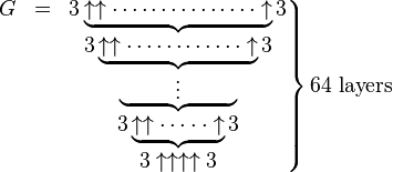 $latex G = g_{64}, where g_1 = 3\uparrow\uparrow\uparrow\uparrow3, g_n = 3\uparrow^{g_n-1}3&s=3$
